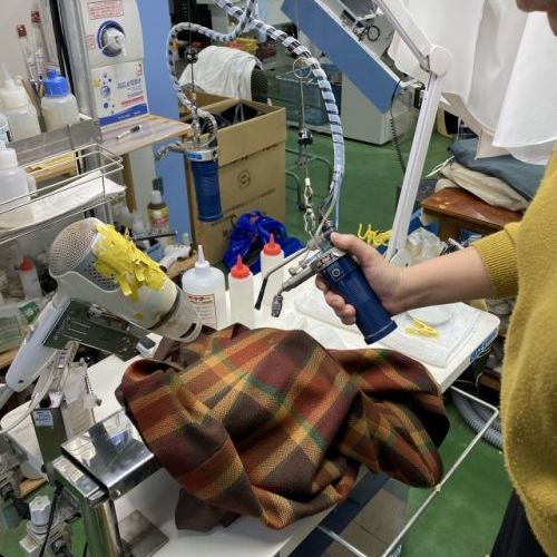 さまざまなシミの状態を見極め専用の機械と特殊な溶剤を使って、一点一点手作業でシミを落としていきます。